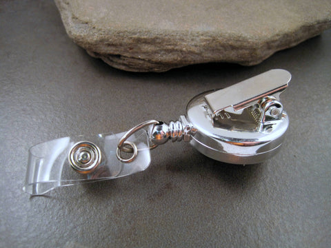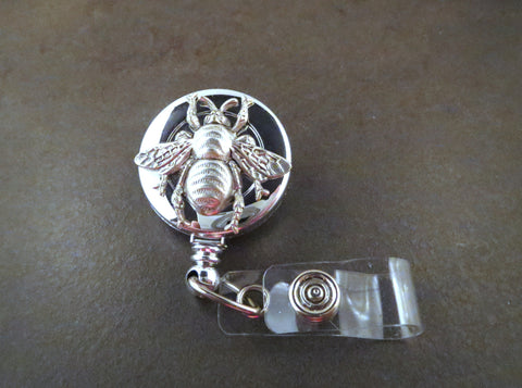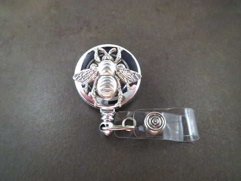 A handsome oxidized Sterling Silver Plated brass bee has been set in the middle of a silver retractable badge holder. The badge holder has a metal clip for fastening. Your badge holder will come in a velvet pouch for gifting and storage.