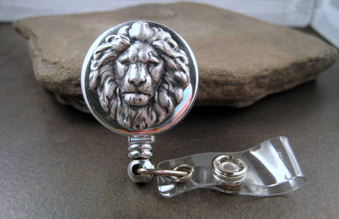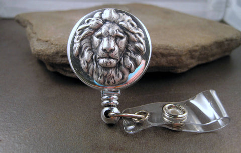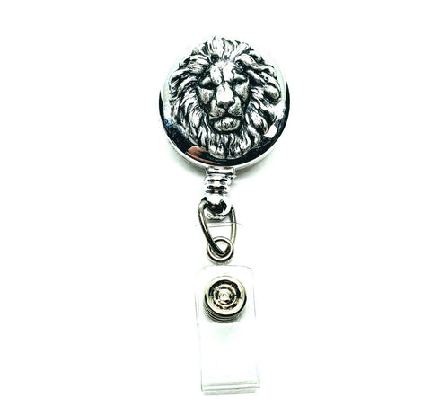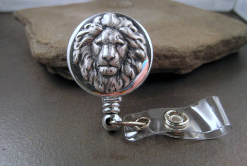 A handsome oxidized Sterling Silver Plated brass lion has been set in the middle of a silver retractable badge holder. The badge holder has a metal clip for fastening. Your badge holder will come in a pouch for gifting and storage.