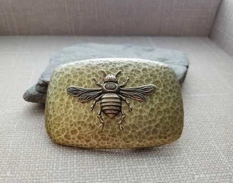 A high quality bronze hammered belt buckle has been set with a detailed oxidized brass bee stamping. The buckle fits up to a 1 1/2" belt and will come in a velvet gift pouch.