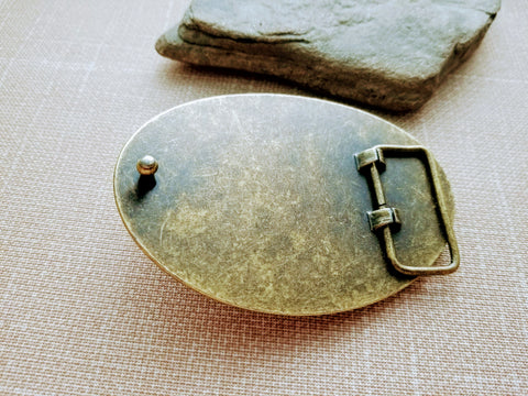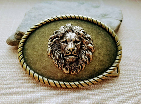 A high quality antique bronze buckle has been set with a detailed oxidized brass lion. The buckle measures 2 3/4" x 3 3/4" and can be used with a snap belt up to 1 1/2" wide. Your buckle with come in a nice velvet pouch.