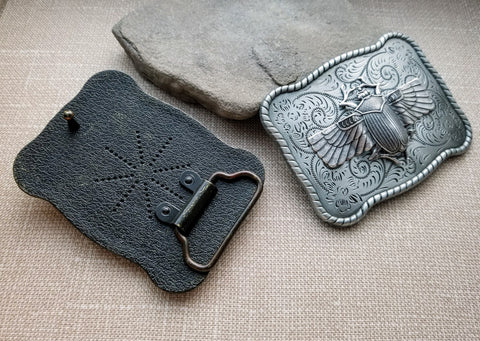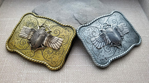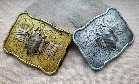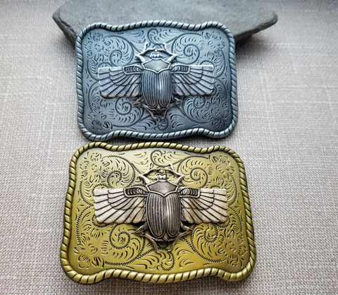 A high quality brass buckle has been set with a detailed oxidized silver or brass scarab. The buckle measures 2 3/4" x 3 3/4" and can be used with a snap belt up to 1 1/2" wide. Your buckle with come in a nice velvet pouch.