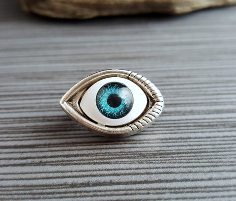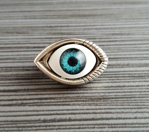 A highly detailed antique silver eyeball has been attached to a high quality pin back. Your brooch will come in a pouch for gifting and storage.