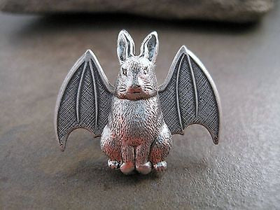 A highly detailed oxidized silver brass bunny is sporting a pair of brass bat wings. The bunny with wings is set upon a high quality silver plated brass clutch pin. Can also be used as a tie tack. Your brooch will come in a box tied with a bow.