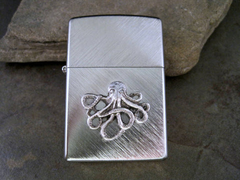 A detailed silver plated brass octopus has been set upon a high quality silver lighter. Your lighter will need to be filled with lighter fluid when you receive it as it can't be full for shipping. Your lighter will come in a gift box tied with a bow.