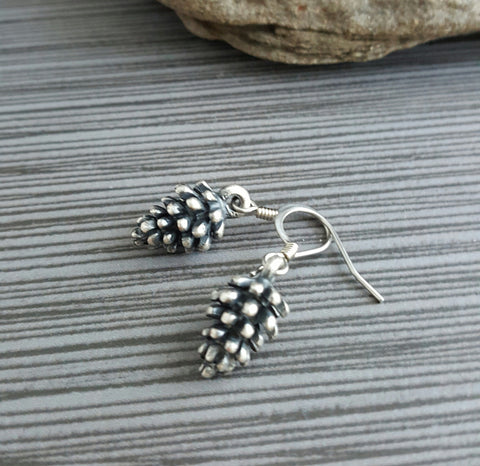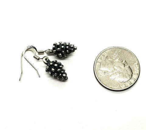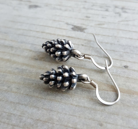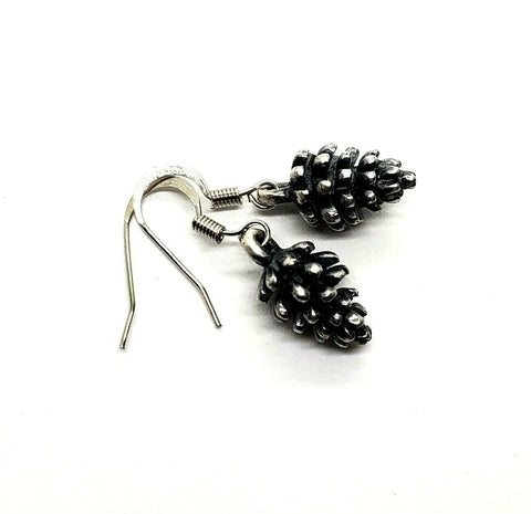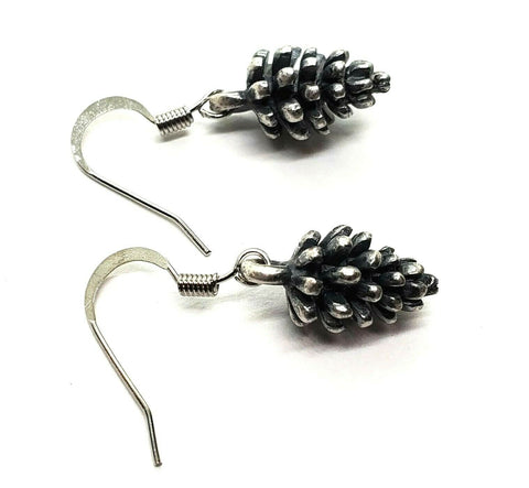 A detailed pair of oxidized sterling silver pinecones suspend from lead and nickel free fish hook ear wires. Your earrings will come in a pouch for gifting and storage.