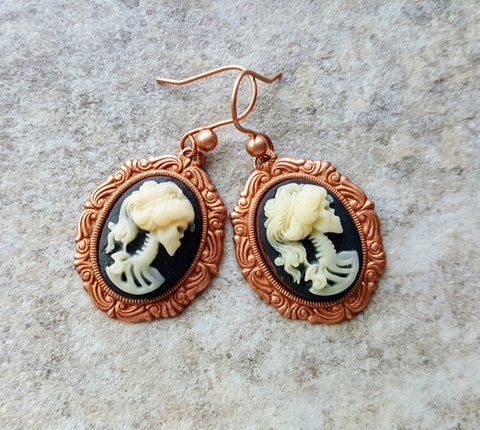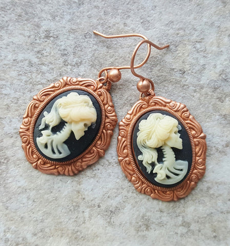 Very pretty Victorian rose gold settings have been set with lady day of the dead cameos. They suspend from high quality lead and nickel free rose gold plated brass ear wires. Your earrings will come in a velvet pouch for gifting and storage.