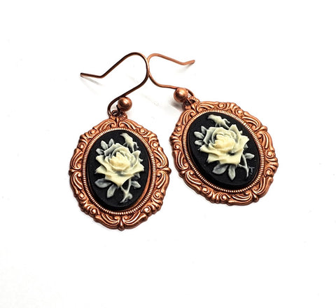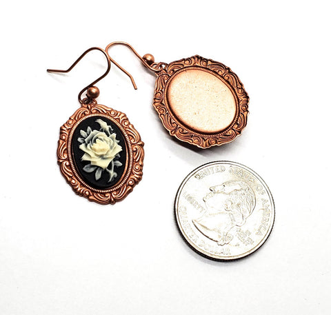 Very pretty Victorian rose gold settings have been set with classic black and white resin rose cameos. They suspend from high quality lead and nickel free rose gold plated brass ear wires. Your earrings will come in a gift pouch.