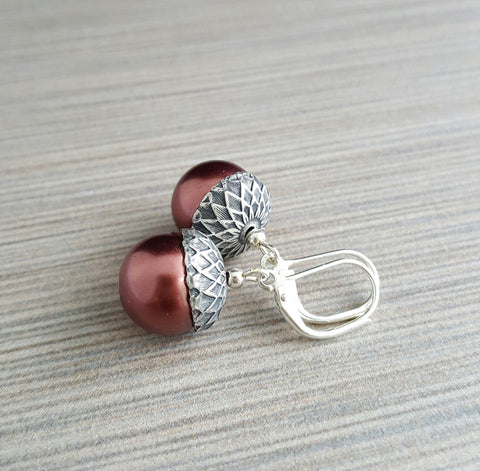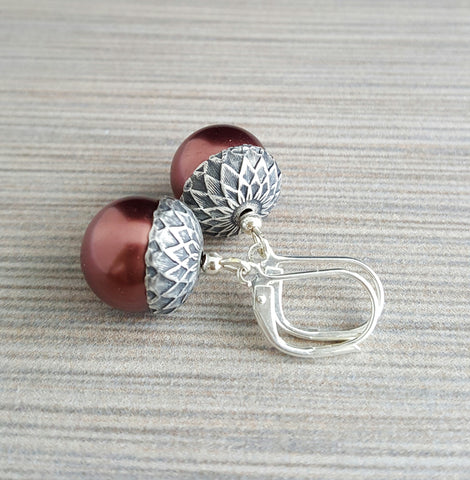 A pair of pretty rust glass pearls with detailed oxidized silver acorn caps suspend from lead and nickel free lever back ear wires. Your earrings will come in a velvet pouch for gifting and storage.