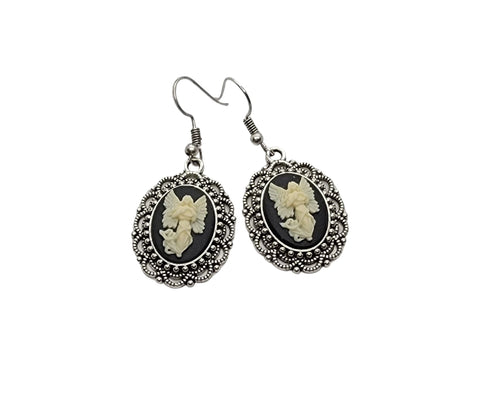 Very pretty Victorian silver settings have been set with classic black and ivory resin angel cameos. They suspend from high quality lead and nickel free silver brass ear wires. Your earrings will come in a gift pouch.