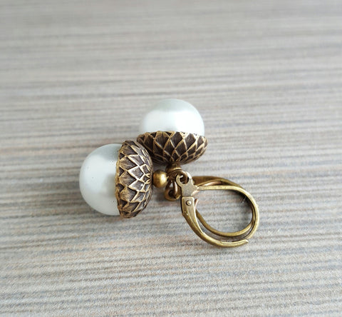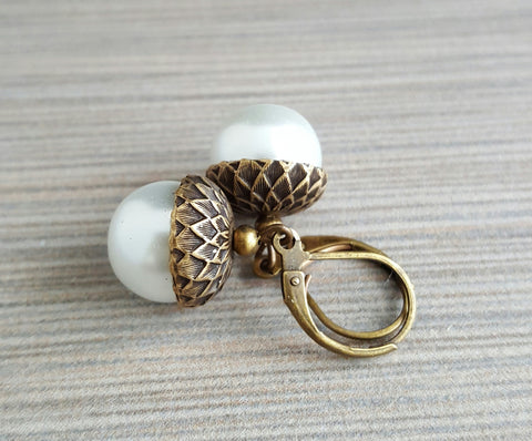 A pair of pretty white glass pearls with detailed oxidized brass acorn caps suspend from lead and nickel free lever back ear wires.  Your earrings will come in a velvet pouch for gifting and storage