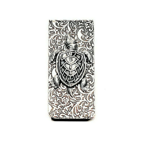 A high quality oxidized silver embossed brass money clip has been set with a detailed oxidized silver turtle. Your money clip will come in a nice velvet pouch for gifting and storage.