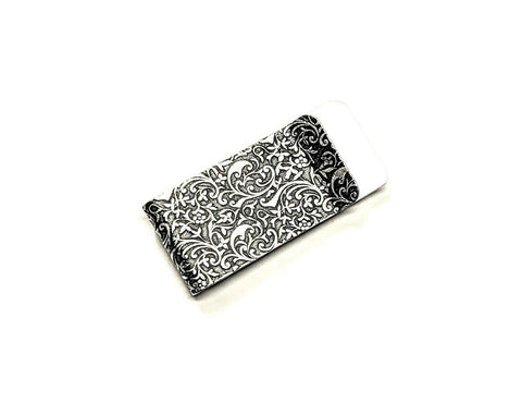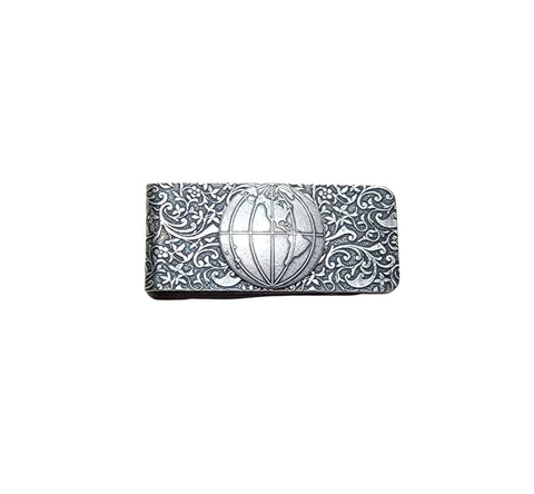 A high quality oxidized silver embossed brass money clip has been set with a detailed oxidized silver globe stamping. Your money clip will come in a nice velvet gift pouch for gifting and storage.