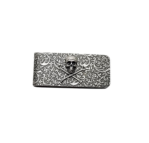 A high quality oxidized silver embossed brass money clip has been set with a detailed oxidized silver skull and crossbone stamping. Your money clip will come in a nice velvet gift pouch for gifting and storage.