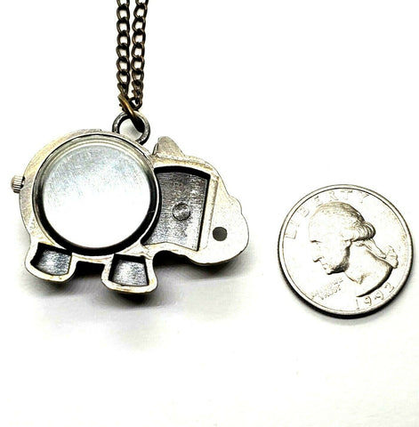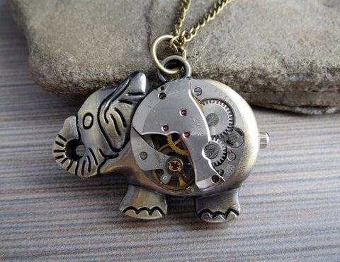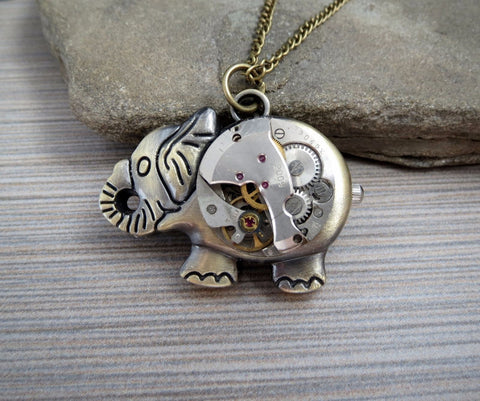 A high quality watch movement has been set upon an adorable elephant watch fob Pendant. The pendant suspends from a nice bronze link chain. Watch movement may vary. This is not an actual watch, the movement no longer works. Your necklace will come in a nice pouch for gifting and storage.