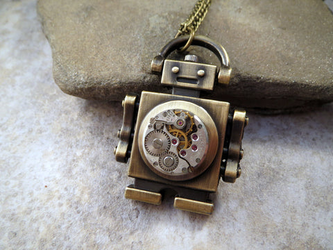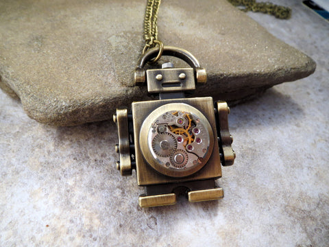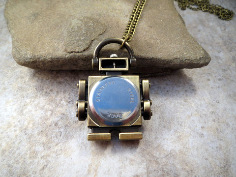 A high quality watch movement has been set upon an adorable robot watch fob Pendant. The pendant suspends from a nice bronze link chain. Watch movement may vary. This is not an actual watch, the movement no longer works.