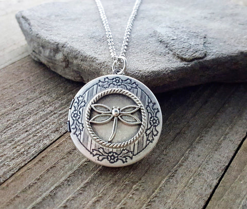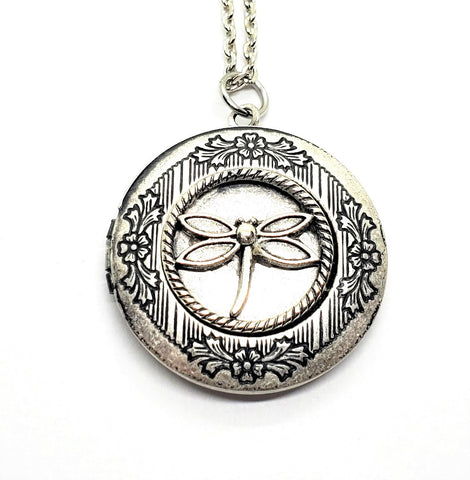 A pretty detailed antique silver locket has been set with an oxidized silver dragonfly. The locket suspends from a lead and nickel free matching link chain. Your necklace will come in a gift pouch.
