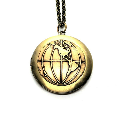 A detailed oxidized brass globe stamping has been set onto an oxidized brass plated locket.  Your necklace will come on a high quality bronze link chain with a matching clasp.  Your necklace will come in a gift pouch.
