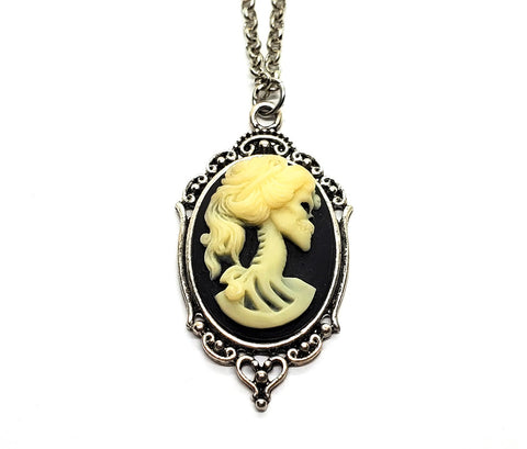 A beautifully detailed antique silver Victorian setting has been set with a beautiful lady skeleton resin cameo then suspended from a very pretty silver plated link chain with a matching clasp. Your necklace will come in a velvet pouch for gifting and storage.