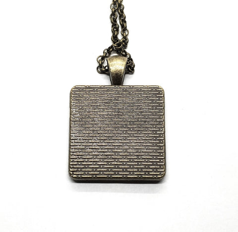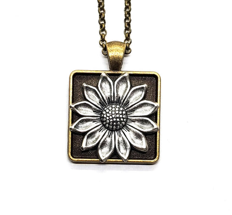 Detailed oxidized silver sunflower is layered on an antique bronze frame pendant. The pendant suspends from a high quality antique bronze plated link chain with a matching lobster clasp. Your necklace will come in a gift pouch. Measures: 24" long - Pendant is 1" x 1 1/4"