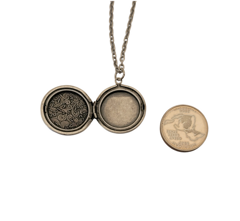 A pretty detailed ornate antique silver locket has been set with an oxidized silver rooster. The locket suspends from a lead and nickel free matching link chain. Your necklace will come in a pouch for gifting and storage.