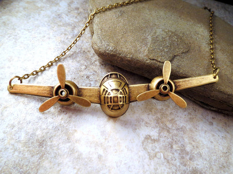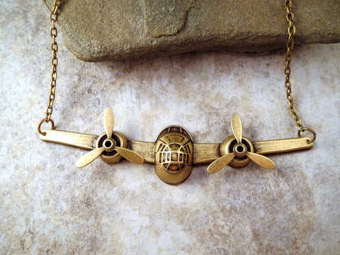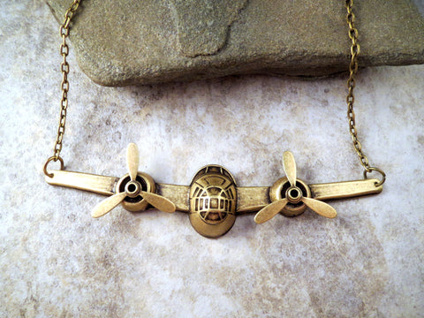 Handmade Steampunk Oxidized Brass Airplane Necklace With Propellers