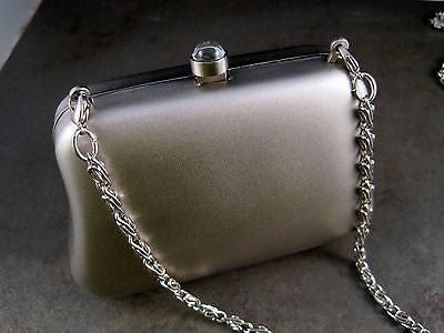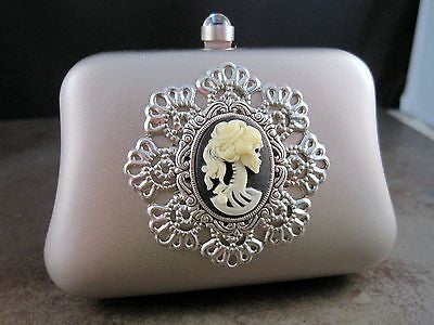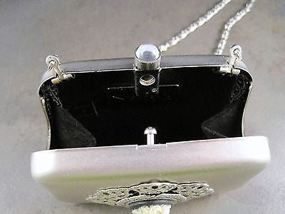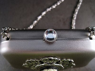 A gorgeous matte silver metal minaudiere with chain has been adorned with a pretty silver filigree and then set with a Victorian setting that holds a very detailed skeleton lady cameo. This sweet little purse has a pretty opalescent button closure and is lined with black velvet and a nice quality silver shoulder chain that is removable. Your bag will come in it's own fabric drawstring bag. Perfect for a lipstick, money and credit cards...after all what else does a girl need :)