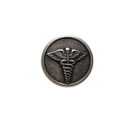 A detailed antique silver Caduceus medical symbol has been set on a high quality silver clutch pin. Your pin will come in a velvet pouch for gifting and storage.