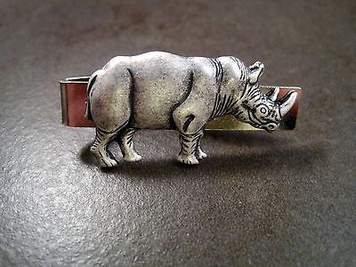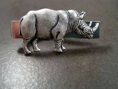 A handsome oxidized sterling silver plated brass rhino has been set upon a high quality silver plated tie bar. Your tie clip will come in a nice gift box tied with a bow.