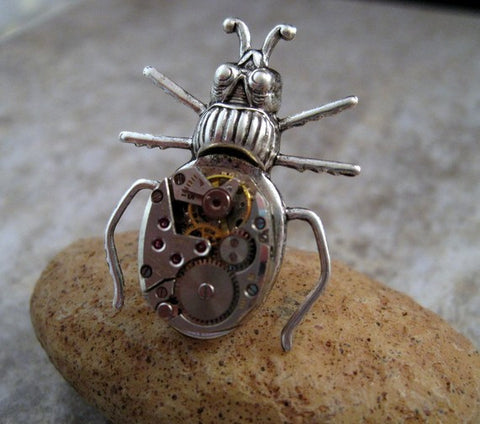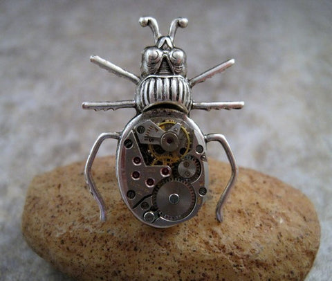 A very nice mechanical watch movement set on an antiqued silver plated brass beetle setting. Awesome conversation piece!!!