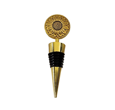 A beautiful oxidized gold brass sunflower is set in a high quality gold wine bottle stopper. Your stopper will come in a nice velvet drawstring pouch for gifting and storage