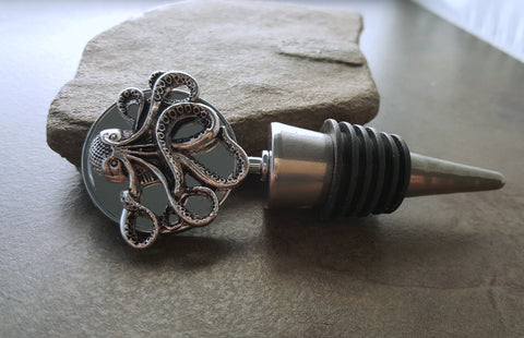 Adorable oxidized silver plated brass octopus has been set upon a high quality silver wine bottle stopper. Your stopper will come in a nice velvet drawstring pouch.