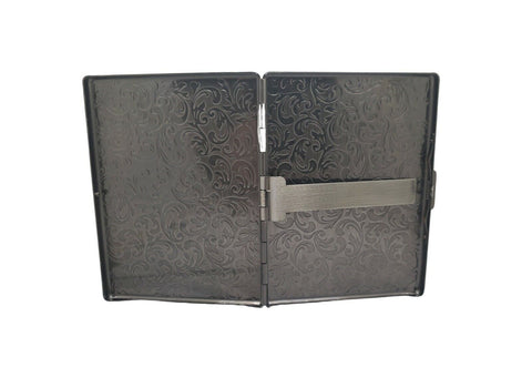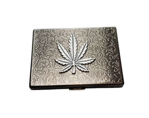 A gorgeous antiqued silver embossed cigarette case has been embellished with an oxidized silver marijuana left. The case holds approximately 8 cigarettes or can also be used as a money holder. Your case will come in a velvet drawstring pouch.