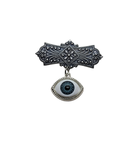 A highly detailed antique silver eyeball suspends from a beautiful silver ox finding with a quality pin back. Your brooch will come in a velvet pouch for gifting and storage.