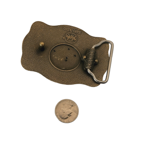A high quality antique brass buckle has been set with a detailed oxidized brass rooster. The buckle measures 2 1/2" x 3 1/2" and can be used with a snap belt up to 1 1/2" wide. Your buckle with come in a nice velvet pouch.