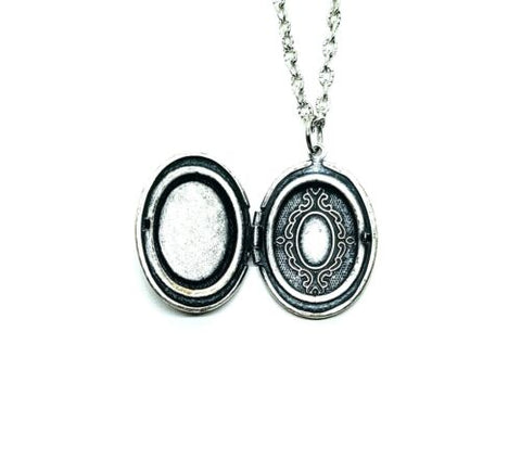 A detailed silver plated Brass nickel and lead free locket has been set with an oxidized sterling silver mushroom. The pendant is suspended from a silver lead and nickel free link chain. Your necklace will come in a velvet pouch for gifting and storage.